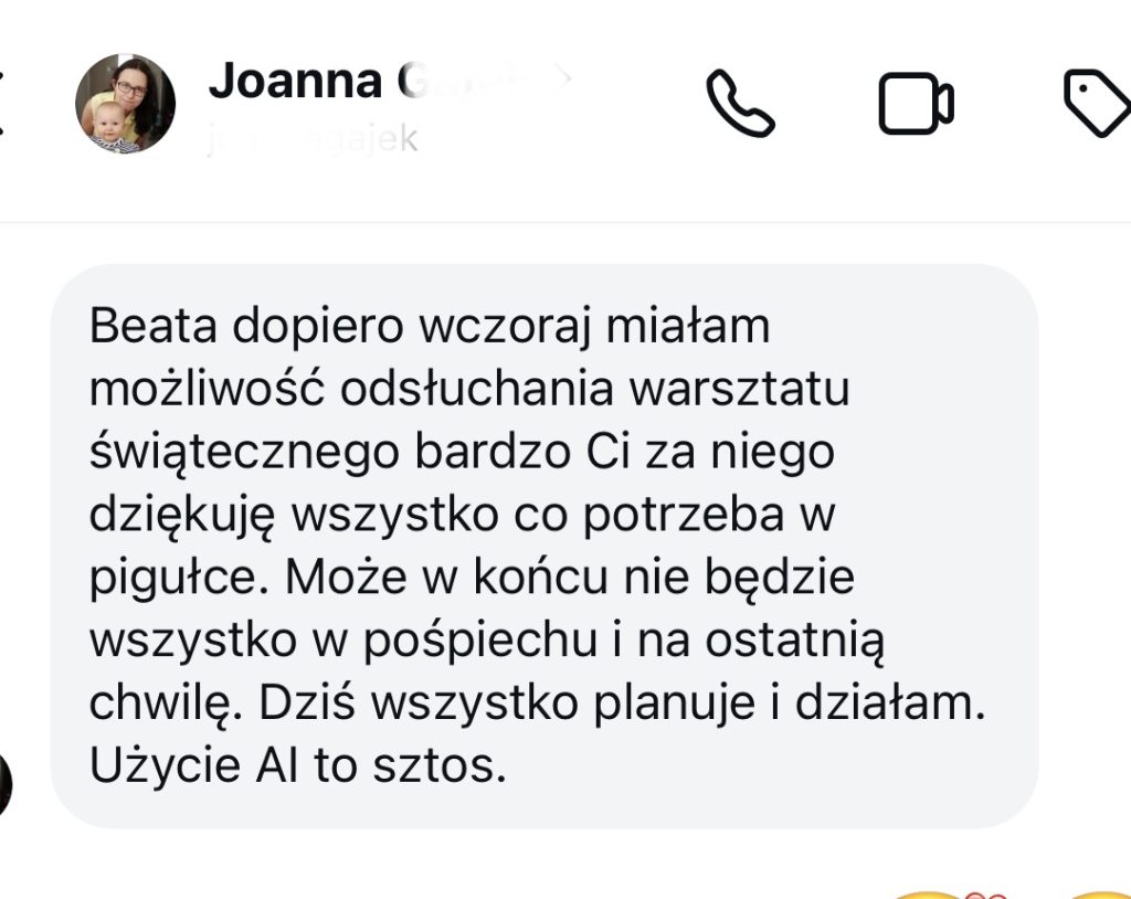 Zrobimy to tradycyjnie (z checklistami) albo z pomocą ChatGPT, za rękę poprowadzę Cię przez proces planowania nawet jak nie czujesz się „techniczna”. Zobaczysz jak AI może odciążyć Cię w planowaniu świąt i oszczędzić godziny i setki złotych!